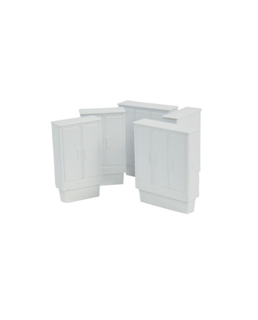 Set mit 5 Schaltschrank-Gehäusen in Spur H0 1:87, gefertigt aus hochwertigem 3D-Druck-Kunststoff. Maße je Stück: 1,9 × 2,0 × 0,5 mm.