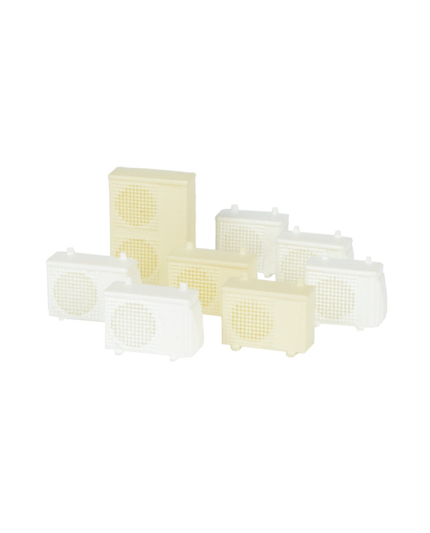 Set mit 8 Klimaanlagen-Außengeräten in Spur H0 1:87, gefertigt aus hochwertigem 3D-Druck-Kunststoff. Maße je Stück: 1,6 × 1,0 × 0,4 mm.
