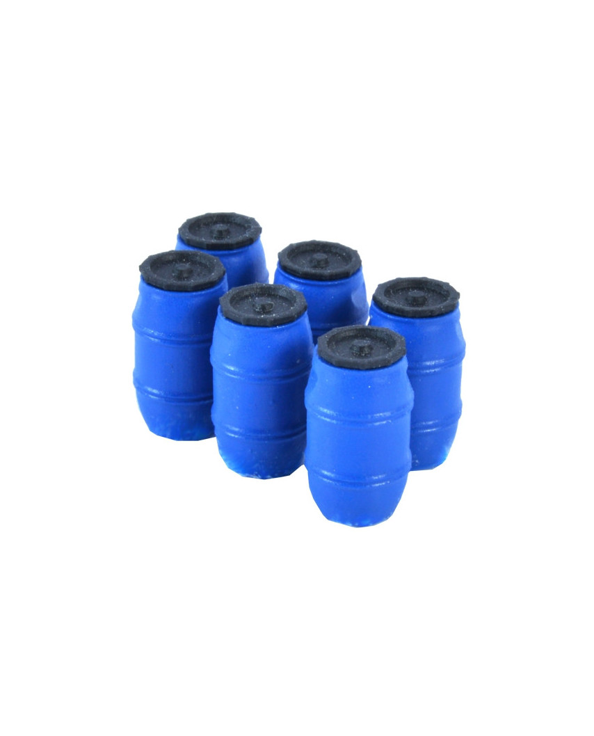 Set mit 6 Industrie-Fässern (220 L) in Blau mit schwarzem Deckel für H0 (1:87). Aus hochwertigem 3D-Druck-Kunststoff. Ca. Maße je Teil: 1,3 x 0,7 x 0,7 mm.