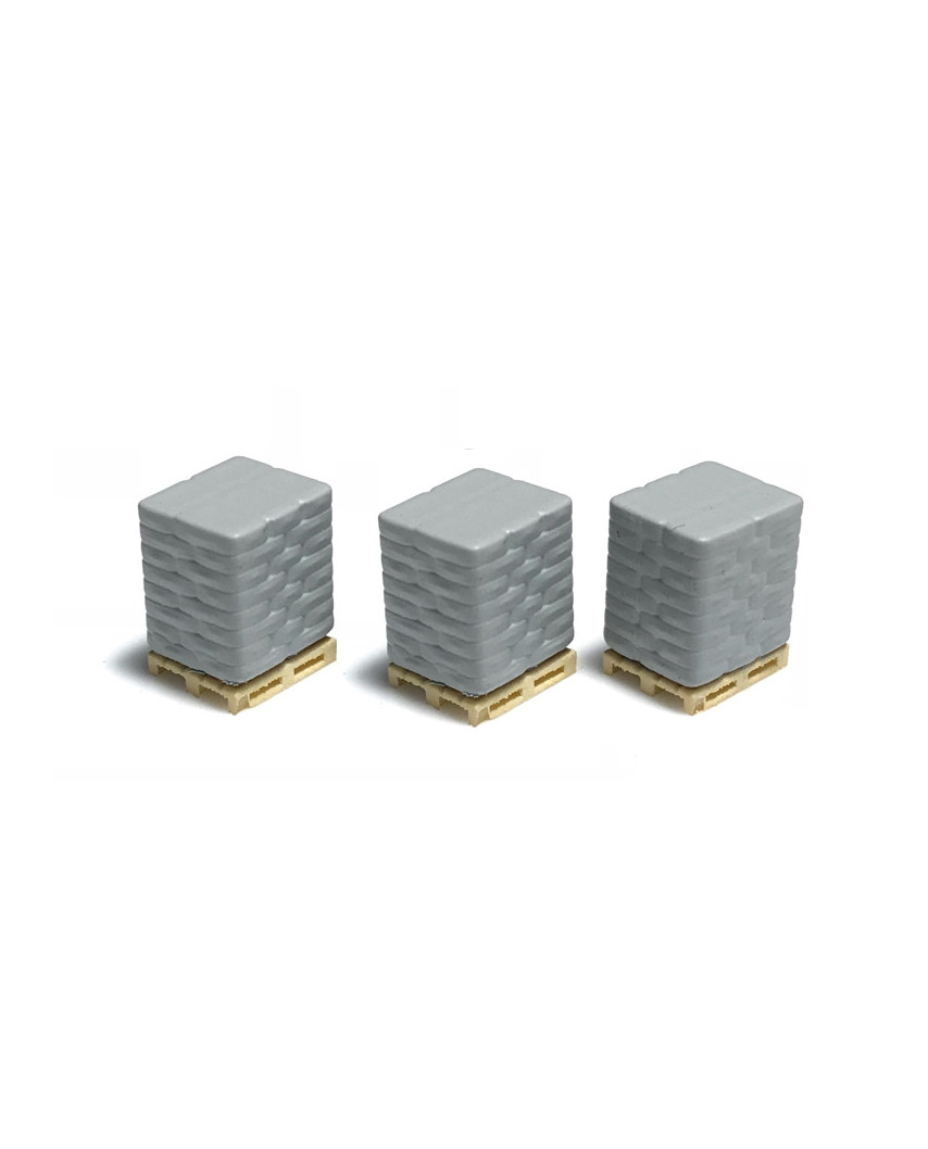 Set mit 3 Paletten mit Zementsäcken in Grau, ideal als Deko-Detail für Baustellen, Lager y Industrie-Szenen. Aus hochwertigem 3D-Druck-Kunststoff. Maßstab N (1:160). Ca. Maße pro Set: 10,6 mm hoch x 7,5 mm breit x 6,2 mm tief.