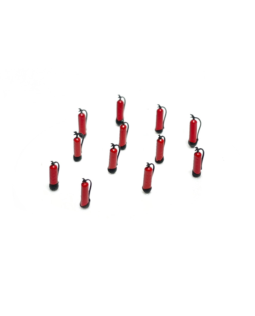 Set mit 12 Feuerlöschern für Industrie-Szenen, Bahnhöfe, Werkstätten y Innenbereiche. Aus hochwertigem 3D-Druck-Kunststoff mit Druckstützen. Maßstab N (1:160). Ca. Maße je Teil: 5,0 mm hoch x 1,4 mm breit x 1,1 mm tief.