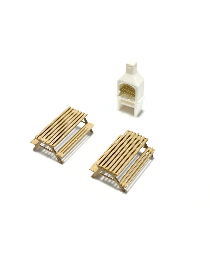 Garden barbecue and 2 picnic tables, ideal as a scenery detail for parks, leisure areas and rural settings. Made in photo-etched brass. Scale N (1:160). Approx. overall size: 5.0 mm high x 12.0 mm wide x 9.0 mm deep.