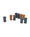 Estos contenedores de 100 litros son un detalle pequeño, pero muy eficaz, para aportar realismo a entornos urbanos, industriales o de servicio. Su tamaño compacto permite distribuirlos en distintos puntos: junto a edificios, en patios interiores, en zonas de carga, cerca de estaciones o en accesos a comercios. La combinación de colores añade variedad y ayuda a crear escenas más creíbles, como si el lugar estuviera en uso a diario.