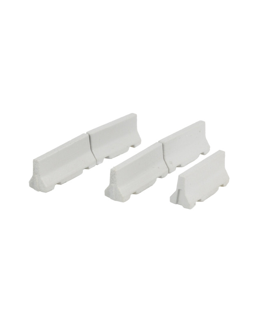 Set de 5 barrières type New Jersey pour échelle N (1:160), fabriquées en plastique d’impression 3D de haute qualité. Dimensions approximatives de chaque pièce : 12,7 mm (hauteur) × 5,5 mm (largeur) × 3,7 mm (profondeur).